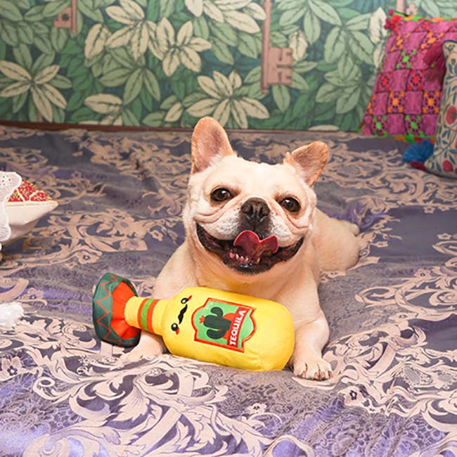 Introducing the perfect toy for your furry tequila lover! This two-in-one toy combines the fun of a plush tequila bottle with the surprise of a lemon dog toy hidden inside.Whether your pup is a tequila connoisseur or just loves a good game of fetch, this toy is sure to provide hours of entertainment. Features:  • Hidden surprise lemon inside.                 • Loaded with squeaker and crinkle paper.         • Great for all kinds of interactive fun. Dog Plush Toy Size: 10"x3.5"x3.5"
